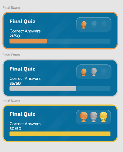 Each correct answer in the quiz will be reflected on the progress bar until user completes it to the maximum - answering all the questions correctly and getting the gold trophy.